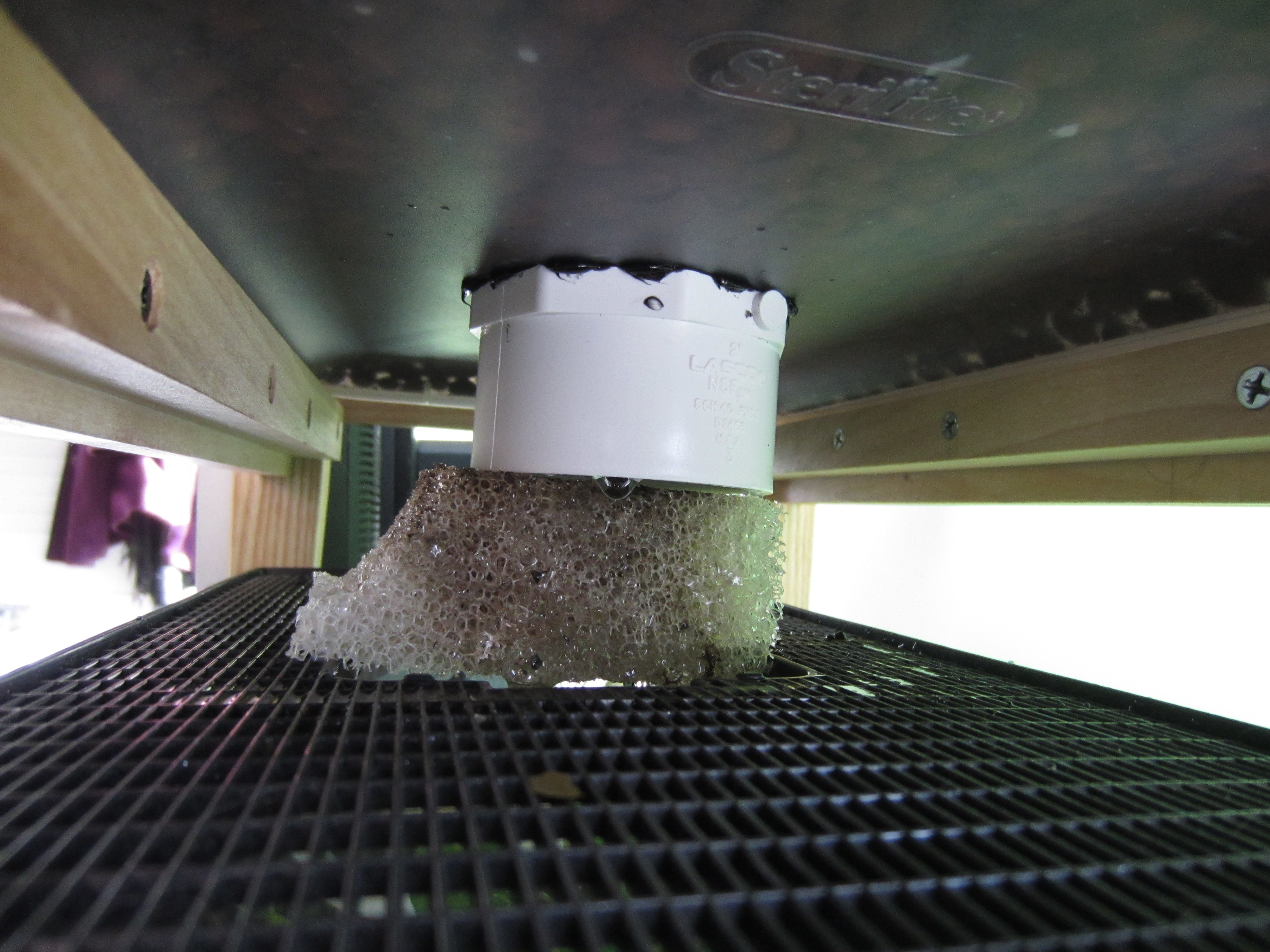 After letting them cure for 48 hours, I put the grow bed back on, added the hydroton, and (most importantly to me) I put another piece of filter sponge between the outlet of the drain and the top of the tank to muffle the sound of the constantly dripping water.