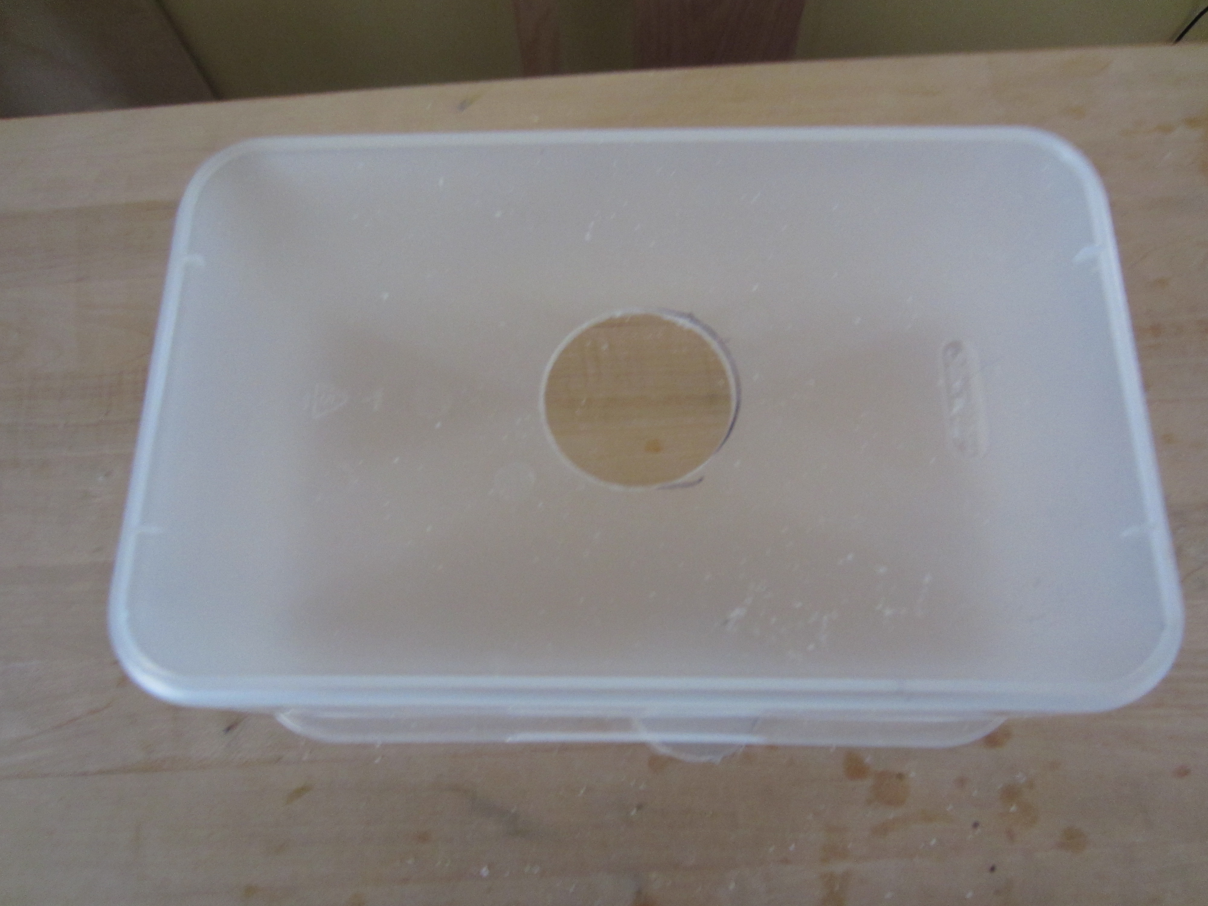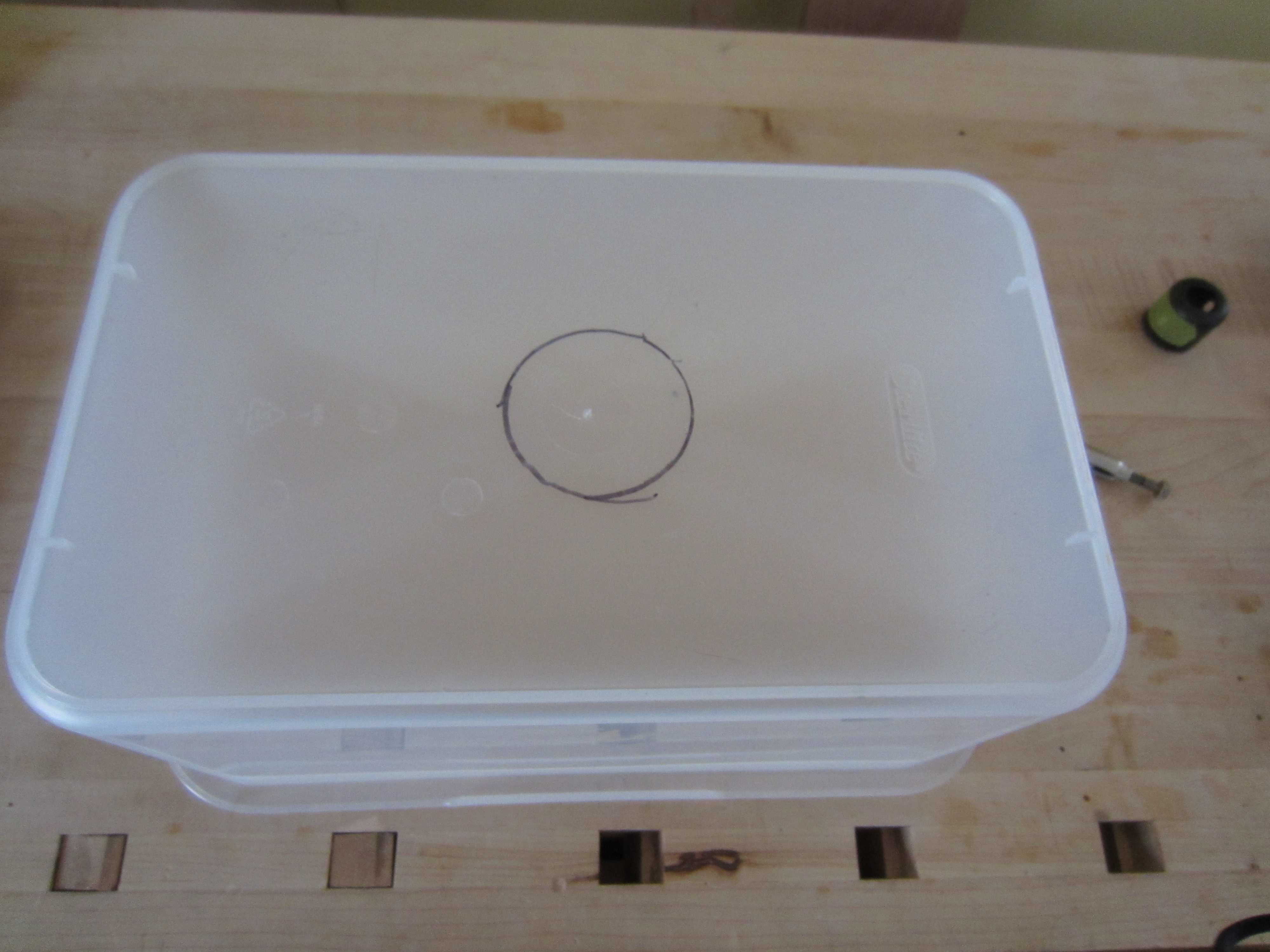 I decided to use an old tea strainer as the mechanical filter at the bottom of the grow bed, so I measured and cut a hole in the bottom of the plastic using a hole saw: