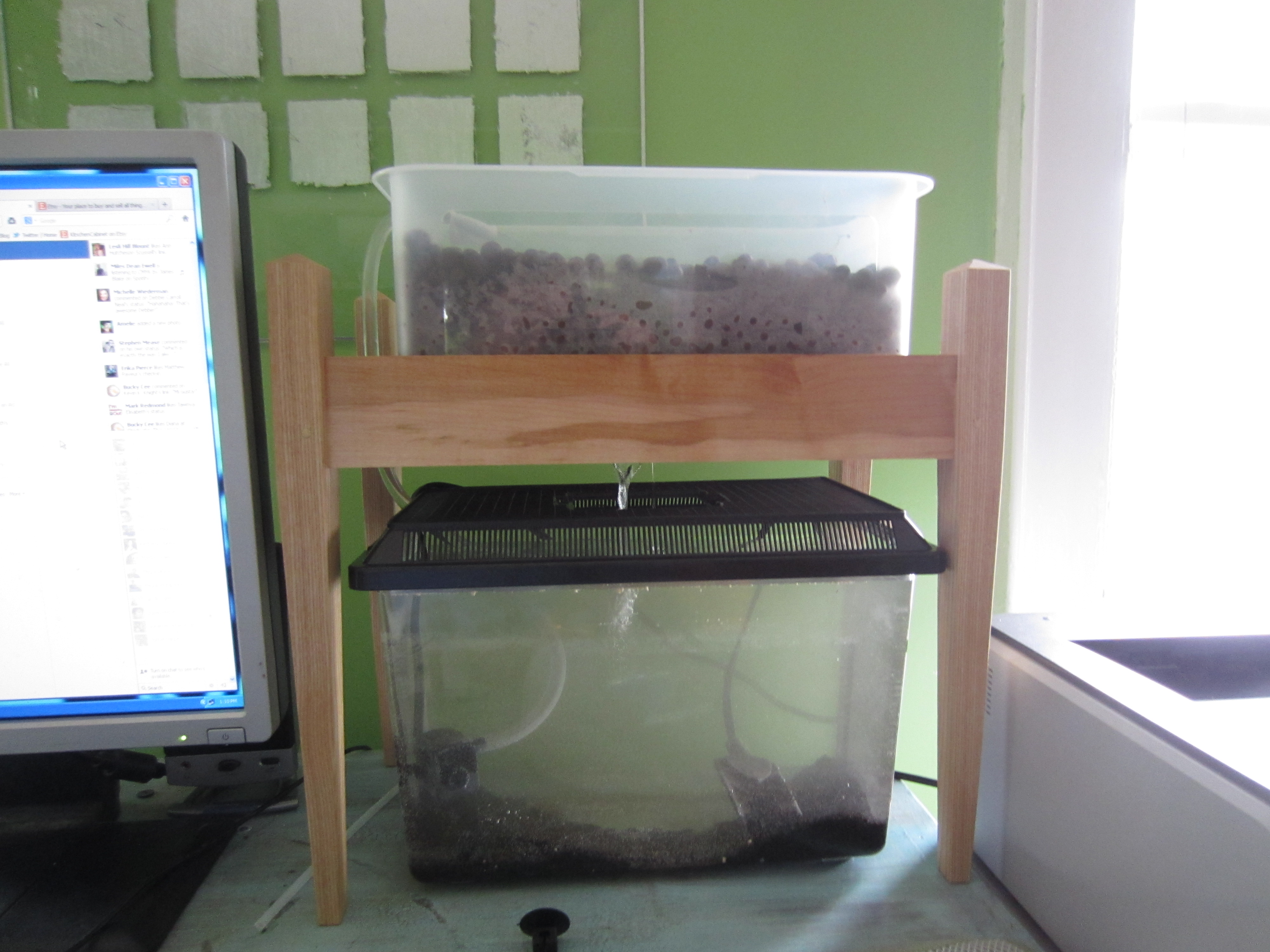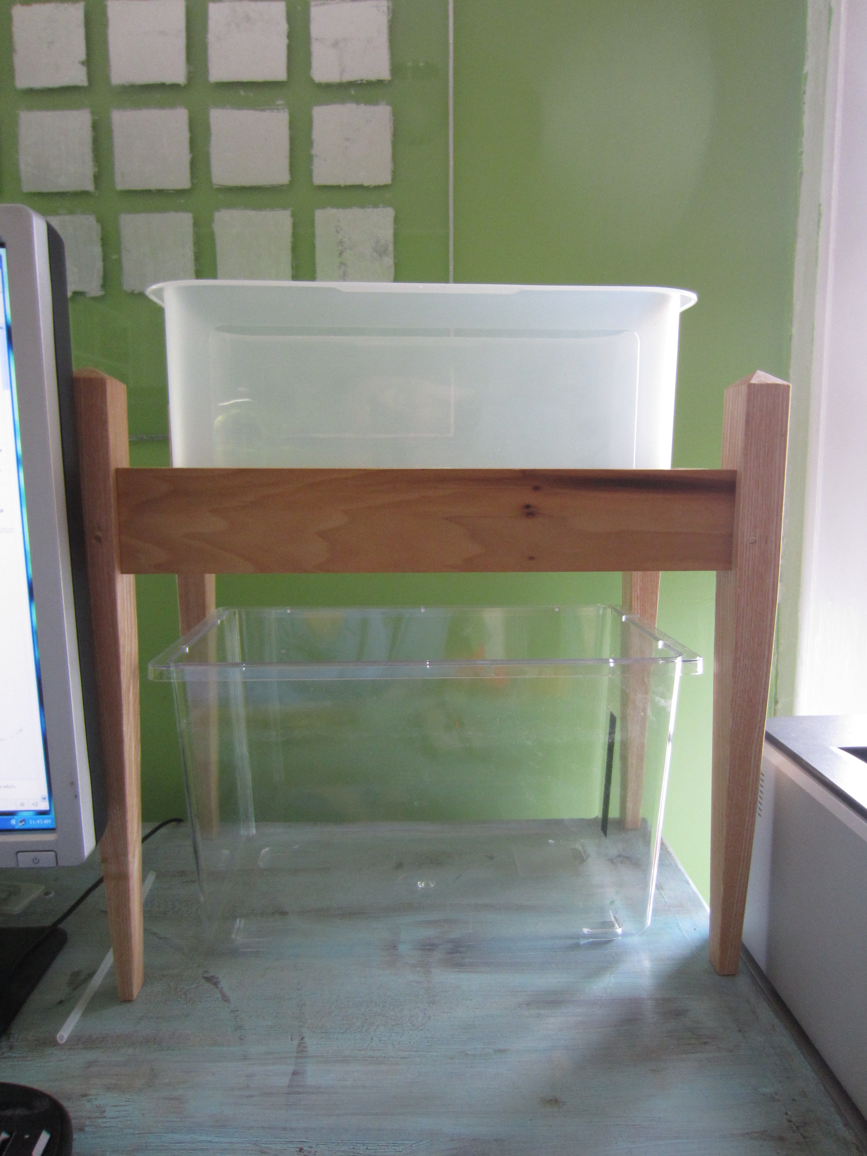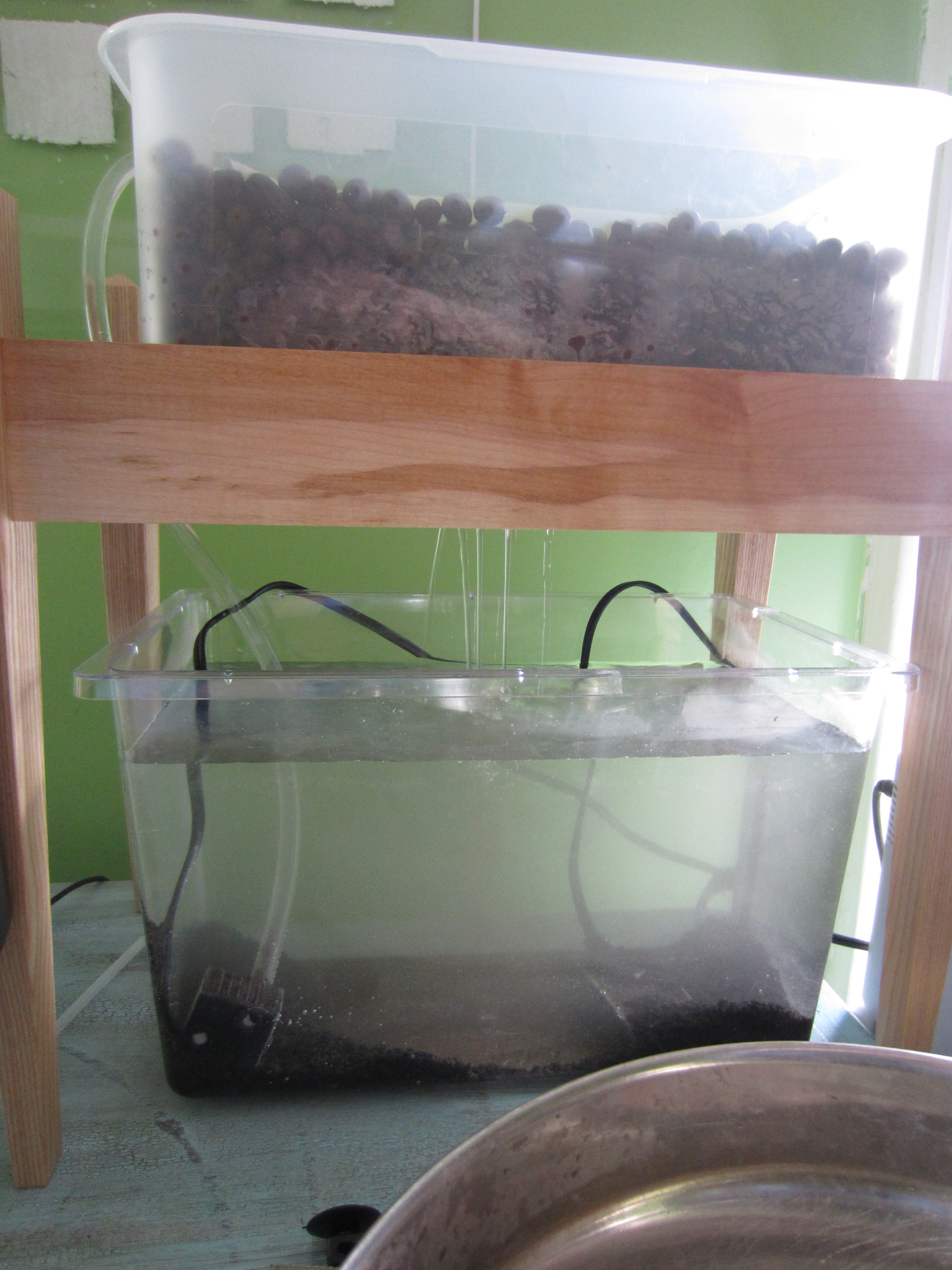 Here’s the set up with the tank below and grow bed above. My partner was kind enough to build me this kick ass stand. Much better than the stand I was going to build by heating and bending sheet plexi…