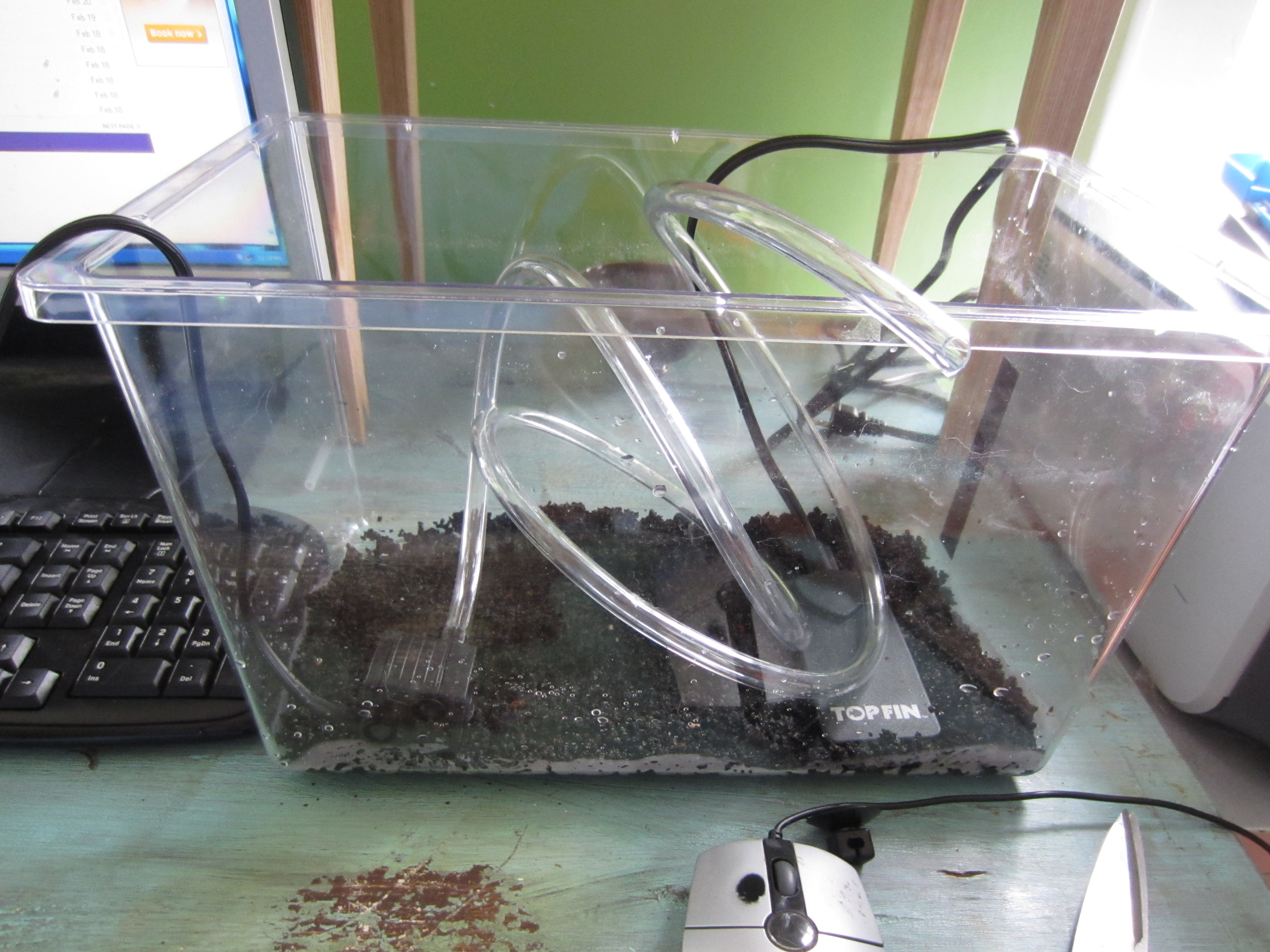 Next up – adding the pump and the heater! I used a very small 10 gph pump since I wanted a very slow flow, and added a 7.5 watt heater to keep everyone nice and toasty. I also added a layer of gravel to the bottom of the tank to give bacteria an extra surface to grab onto.