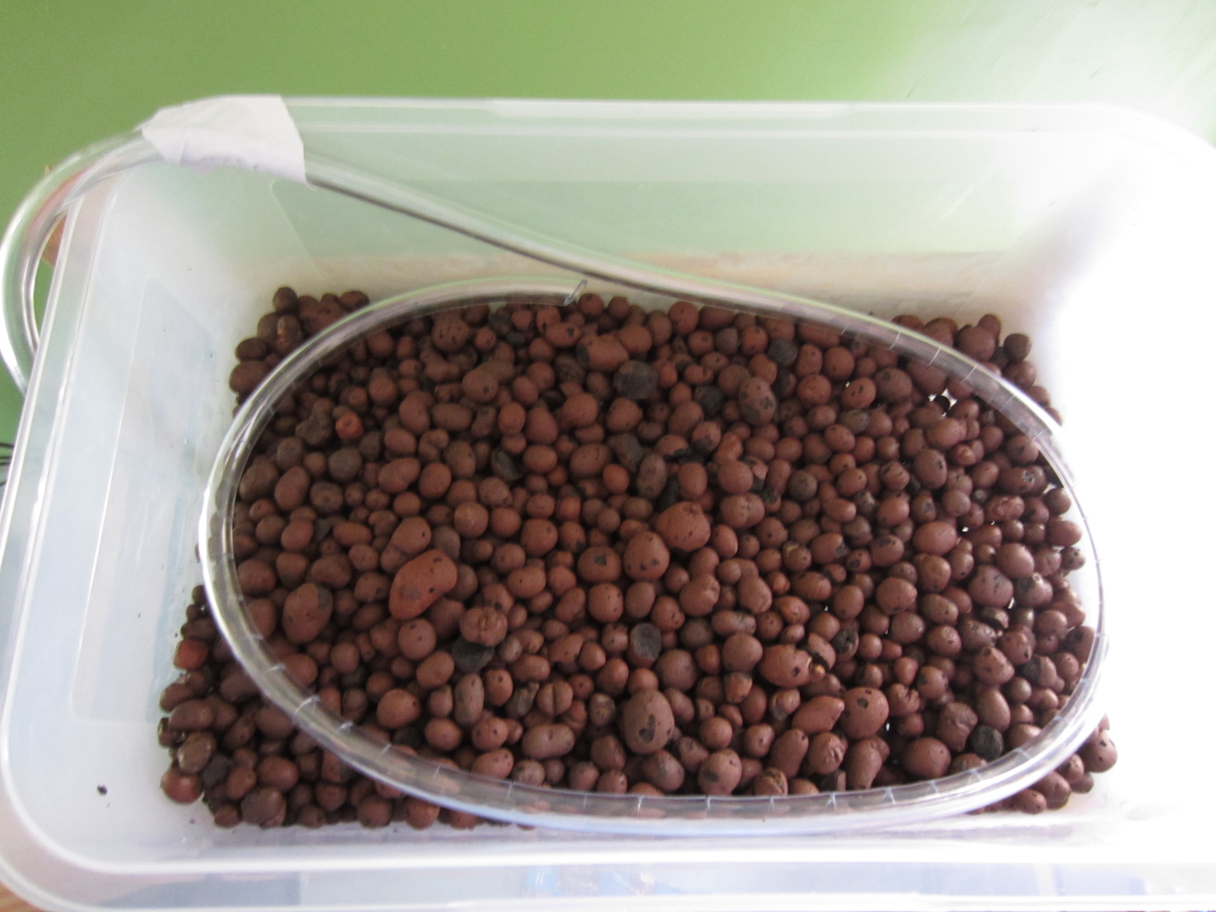 I looked at a lot of different growing media and chose hydroton. I used 5 lbs to fill the 13″ x 8″ container half way.