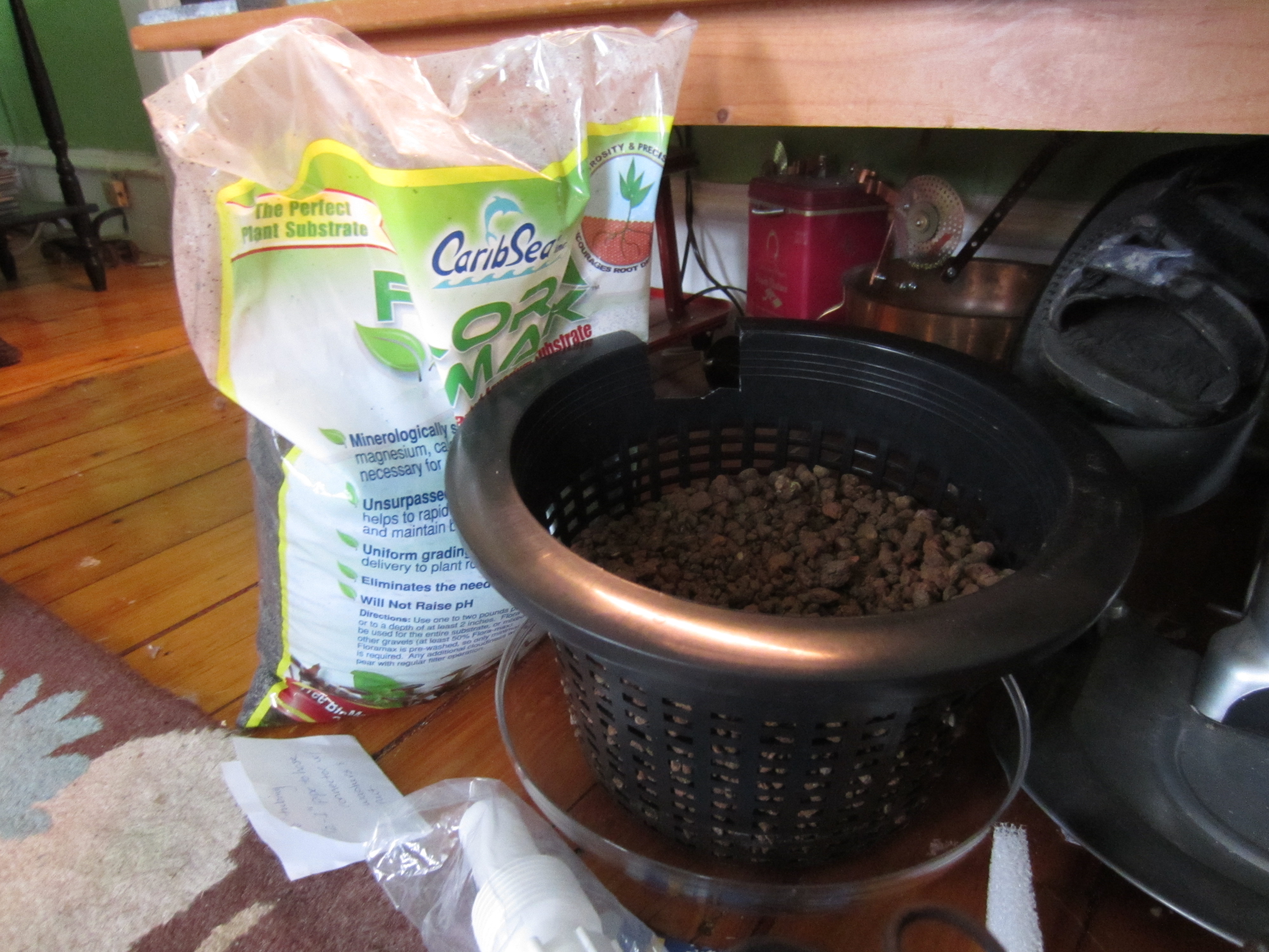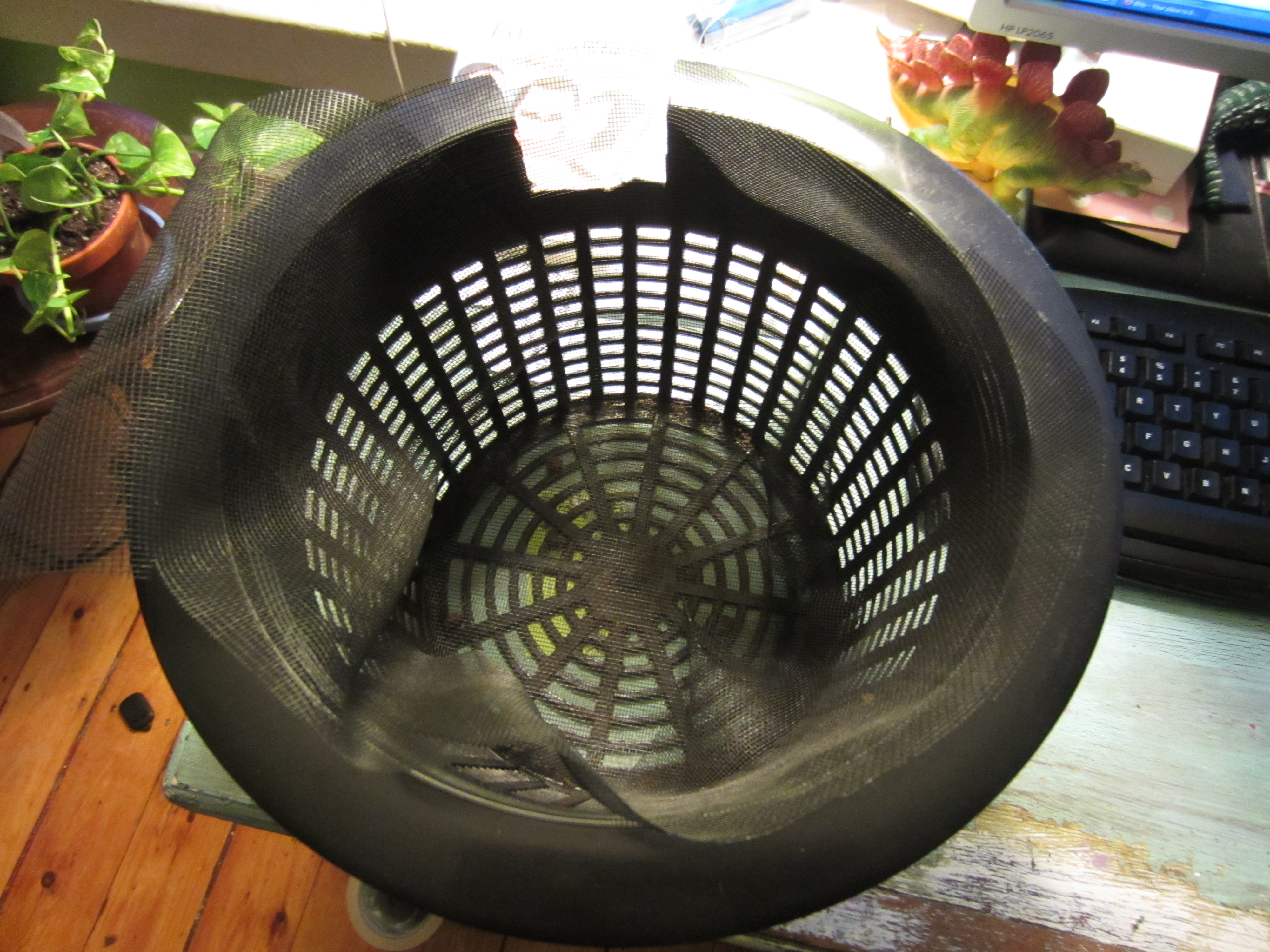 Here’s the slotted basket I used to house most of the media and the plants. I cut out a slot in the top to accommodate the outflow pipe, and lined it with left over window screening I had from a time when I *may* have put a 2×4 through a screen door in my last apartment..