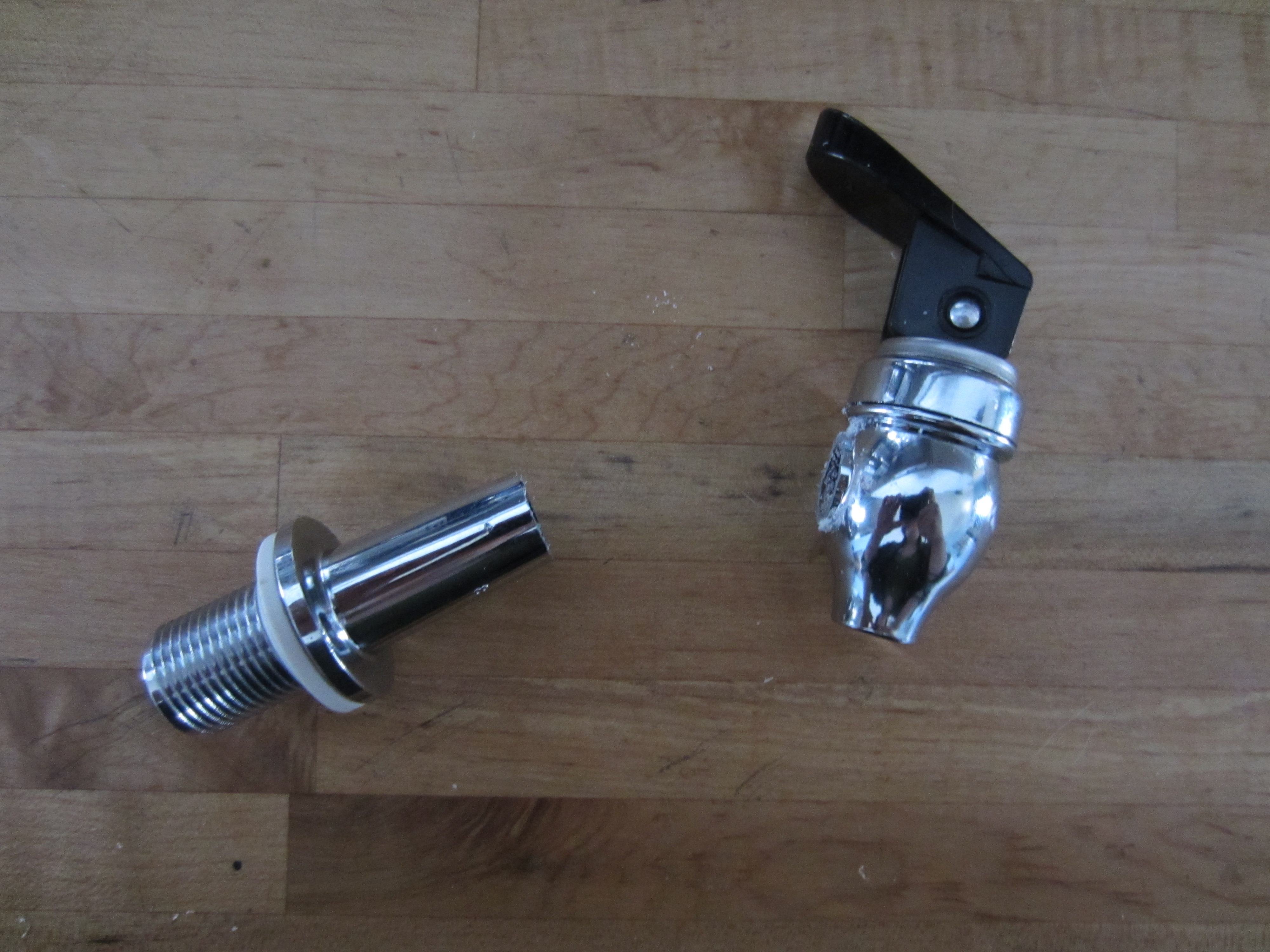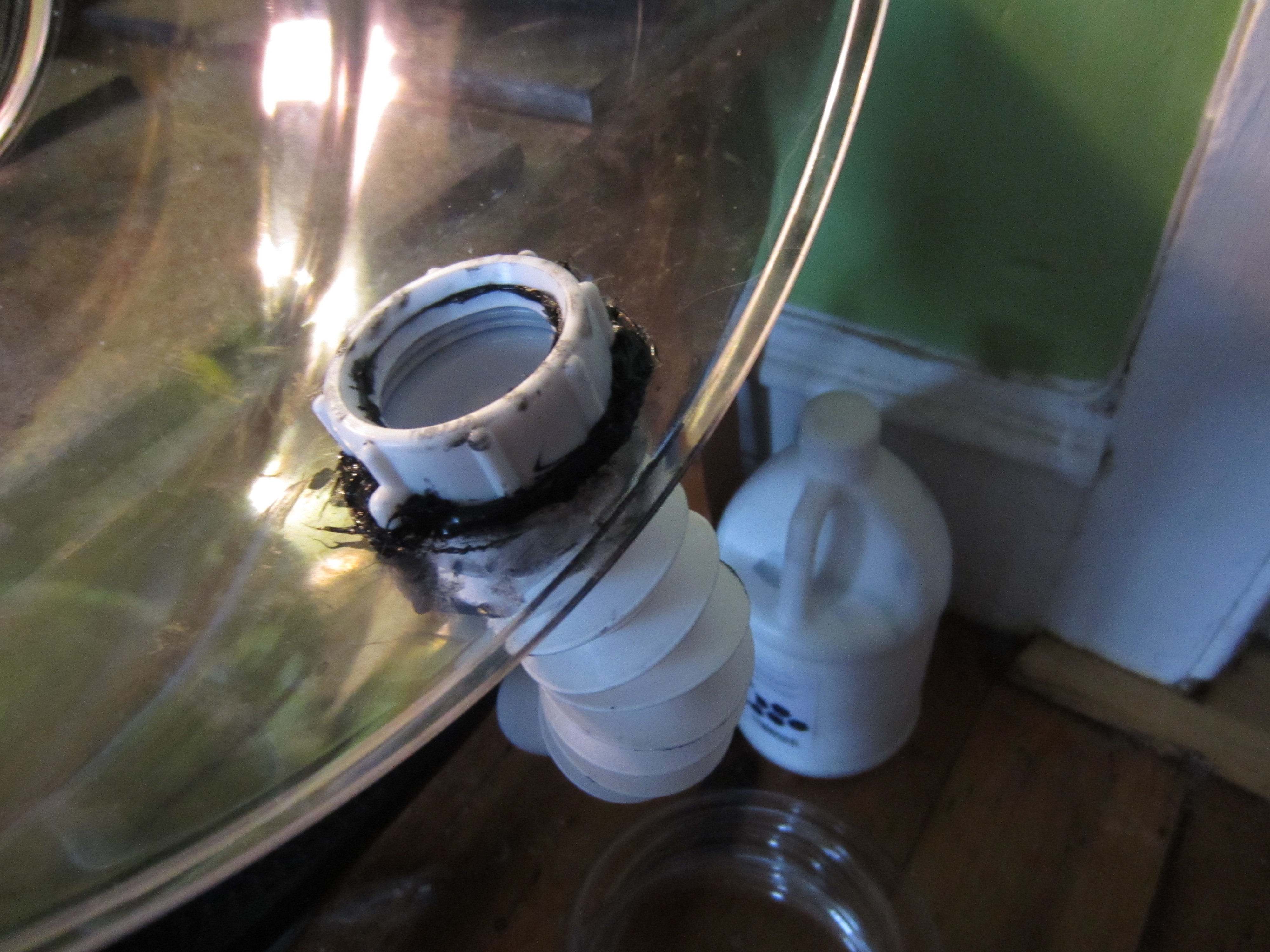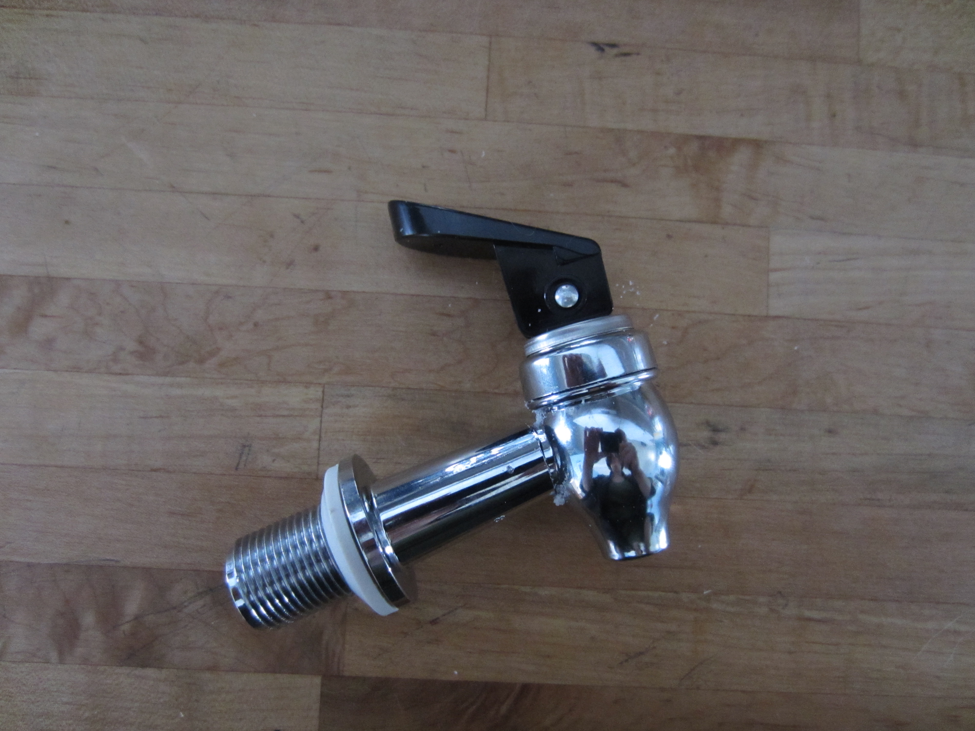 Action shot! Kidding. Just a bad photo. Here’s the beverage dispenser. I figured since the process would be to push water from the tank up through the filter, the dispenser was perfect. It already had a preformed hole in the bottom and was water tight.