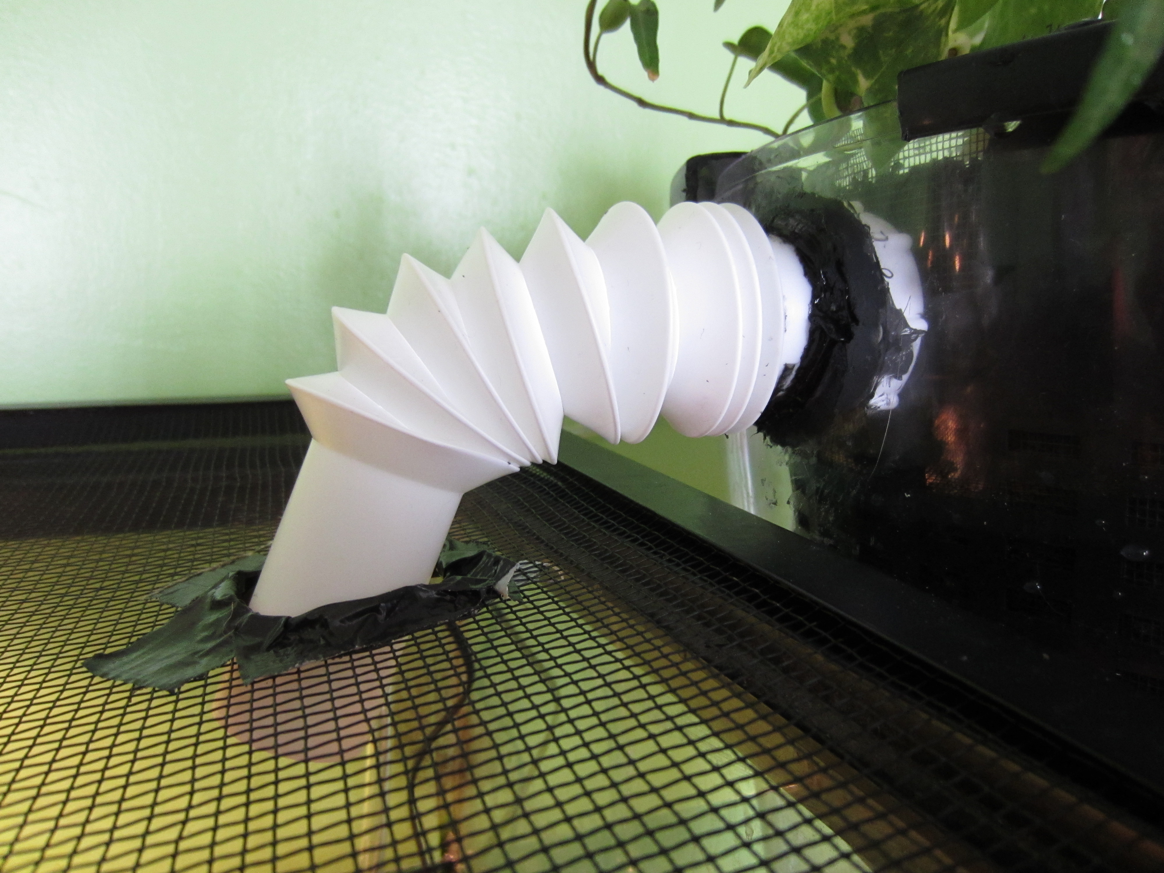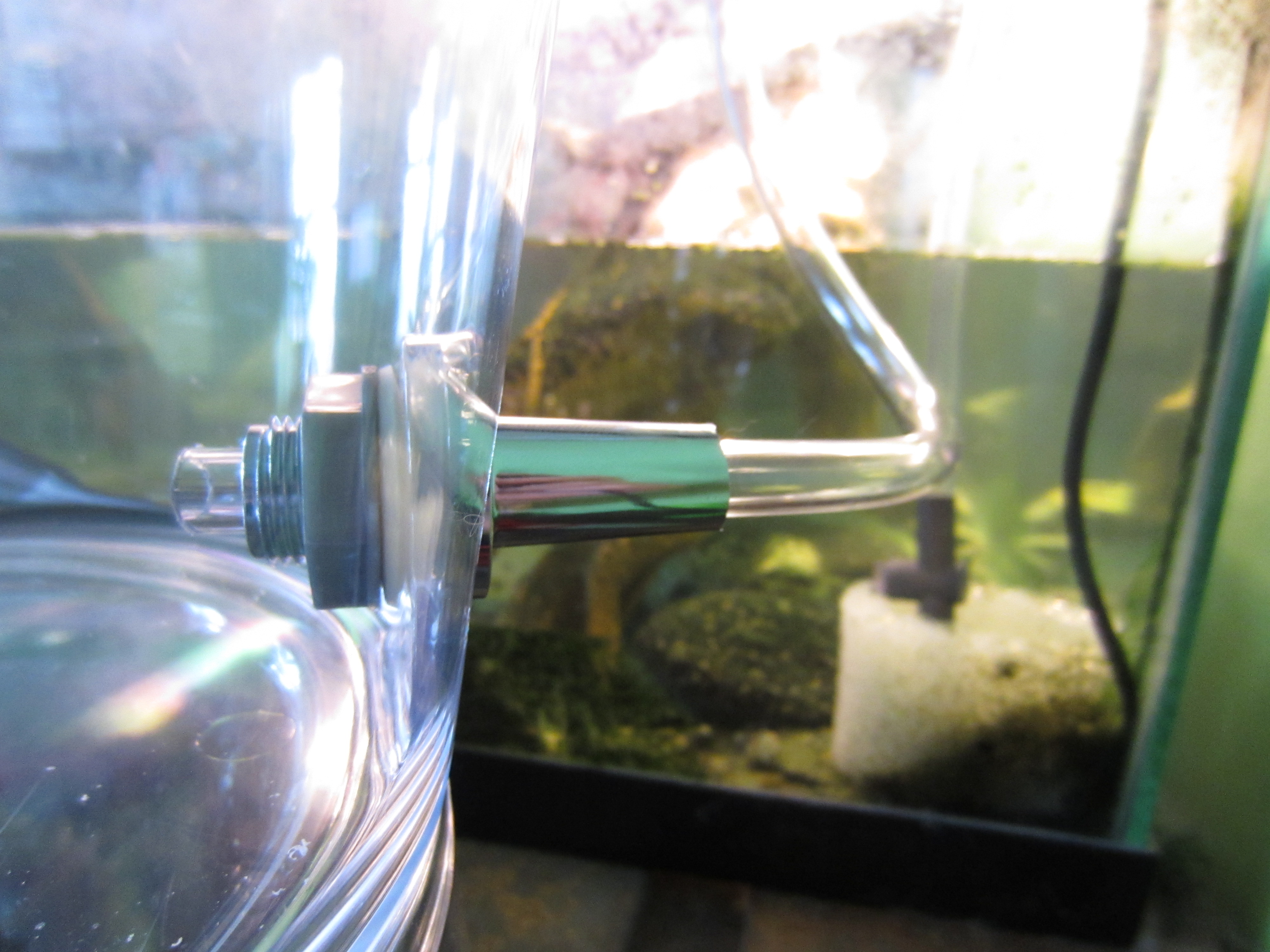 I’m not entirely sure how exactly the pipe extender is supposed to work for plumbing, but after combing the plumbing sections of three hardware stores, I thought it would work well for this. It had both a female and male adapter side, and best of all, the pipe itself accordioned (that may not be an actual word, but you get the point…) into the shape I needed. Since this outflow needed to make a 90 degree angle into my tank, the flexibility was key. A little RTV silicone and a 24 hour curing period make the whole shebang water-tight.