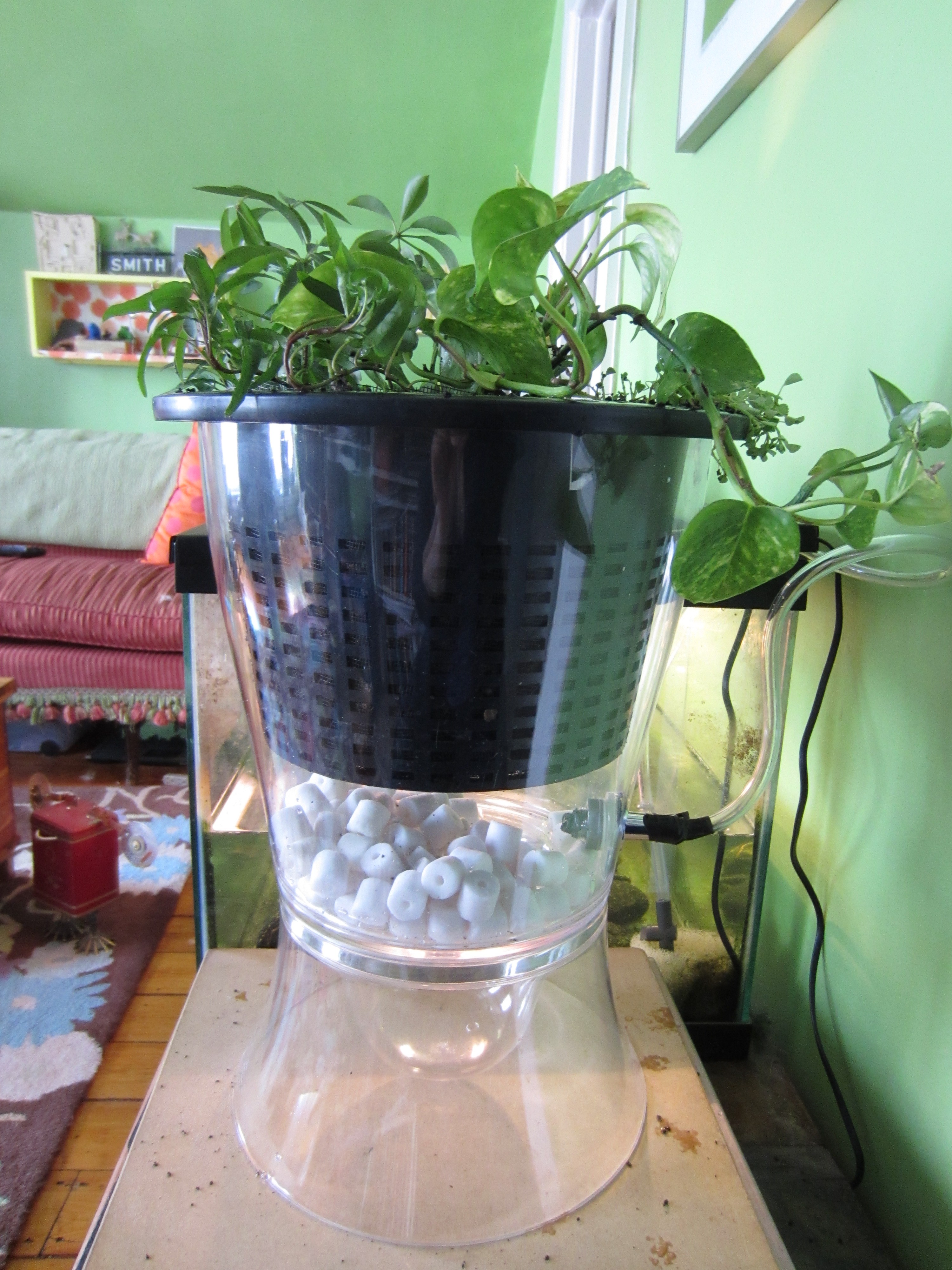 1. It’s still working like a champ! I’ve added a floss filtration layer to the bottom of the basket that the gravel sits in which helps grab any small debris and upgraded the pump that moves the water from the tank up through the filter up to an 89 gph pond pump. The plants that are in it are pothos, schefflera, syngonium, and philodendron, and when they get too big I trim them back and add the trimmings back into the gravel to root. If I went back and made it from scratch again, I’d go with wider diameter plastic tubing. It can get gunked up after months of continual use and I wish I’d gone with something bigger.